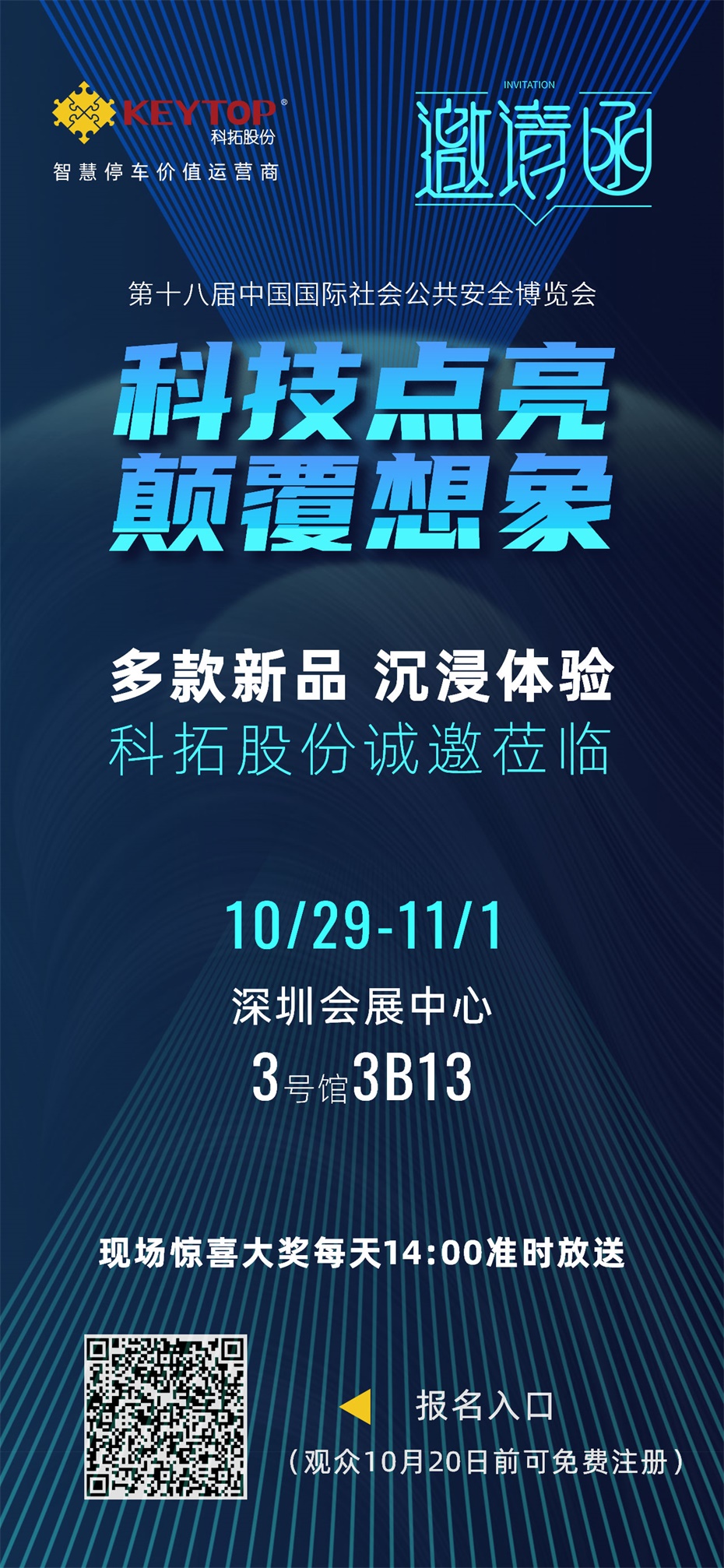 - 2021年10月29日- 11月01日,被視為行業產品技術“風向標”的第十八屆中國國際社會公共安全博覽會(以下簡稱“安博會”)將在深圳福田會展中心隆重舉行。本屆安博會總面積達11萬平方米,5736個標準展位,1263家企業參加展覽,這是疫情后舉辦的全球最大規模的安防專業安博會。作為深耕智慧停車領域15載的企業,科拓股份受邀參加本屆安博會,作為科拓業務矩陣中的重要板塊速泊停車服務要將在展會上露出。